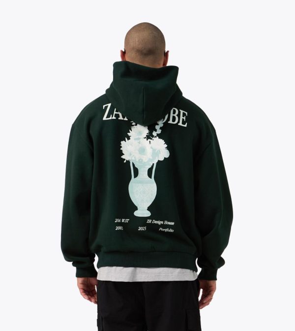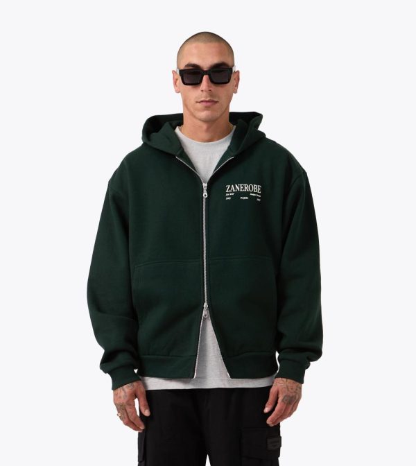 The ZANEROBE Ceramic Box Zip Hooded Sweater in Forest is a heavyweight fleece zip hoodie with a relaxed, slightly cropped fit and clean detailing, giving you everyday comfort, structure and a modern refined look with bold front and back prints.