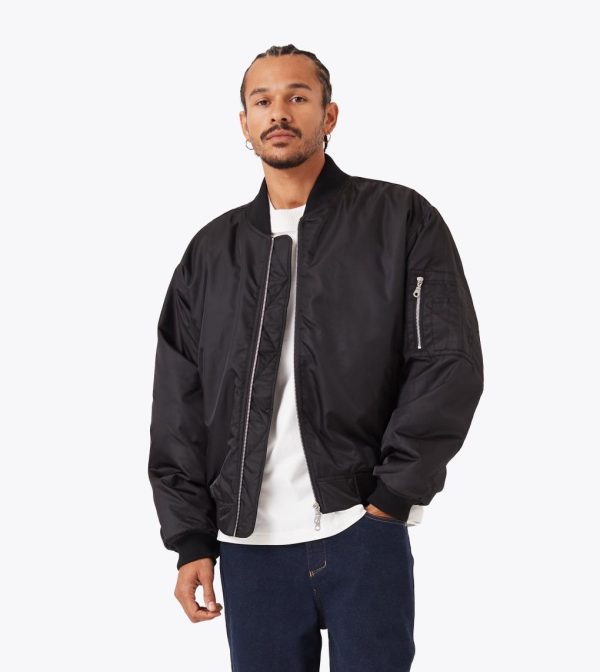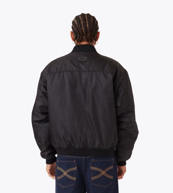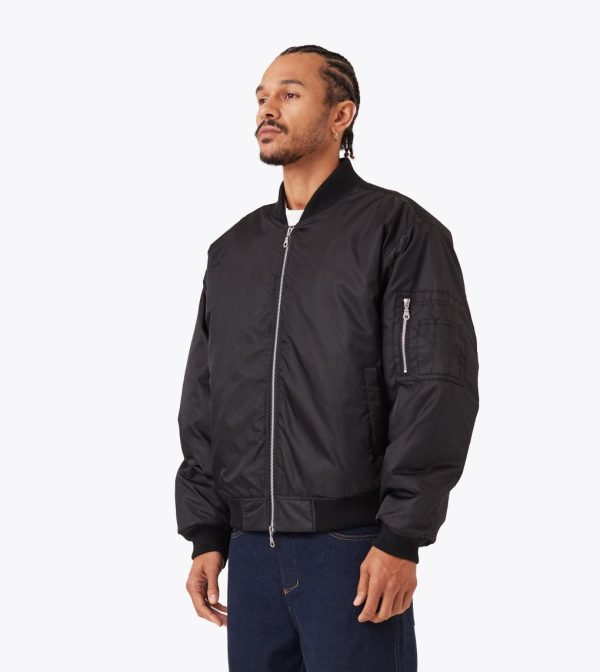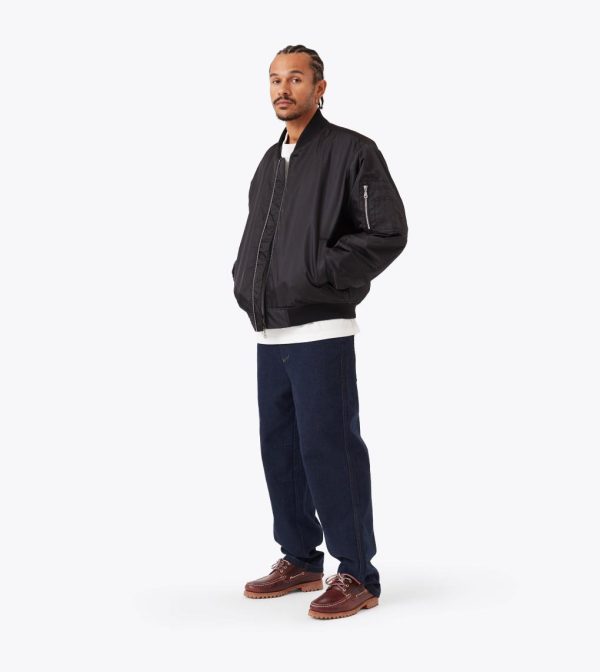 The ZANEROBE Sateen Bomber in Black combines sleek style with practicality. Made from 100% polyester sateen fabric, this bomber jacket features a double-ended aluminum zipper for added versatility and wadding throughout for warmth. The ribbed collar, cuffs, and hems offer a comfortable fit, while the zipper patch pocket on the sleeve adds a functional touch. Finished with a backpack yoke and a rubber ZANEROBE patch, this bomber elevates your outerwear game with a modern, structured design.
